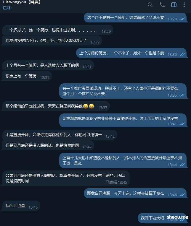 我告诉你们自从他来了就没把他当老大看,除了见面当着他假装笑嘻嘻在公司的零食饮料我就拼命多喝喝不完我就带回来,老娘管你是什么,现在说什么没业绩就要让我自己考虑是继续留着岗位还是离职,如果没业绩被开除就没有底薪,最后被我跟那个所谓的胖总监说我自己离职就给我正常算工资,这让我天天在家等护照等了十几天才下来,还扣我钱