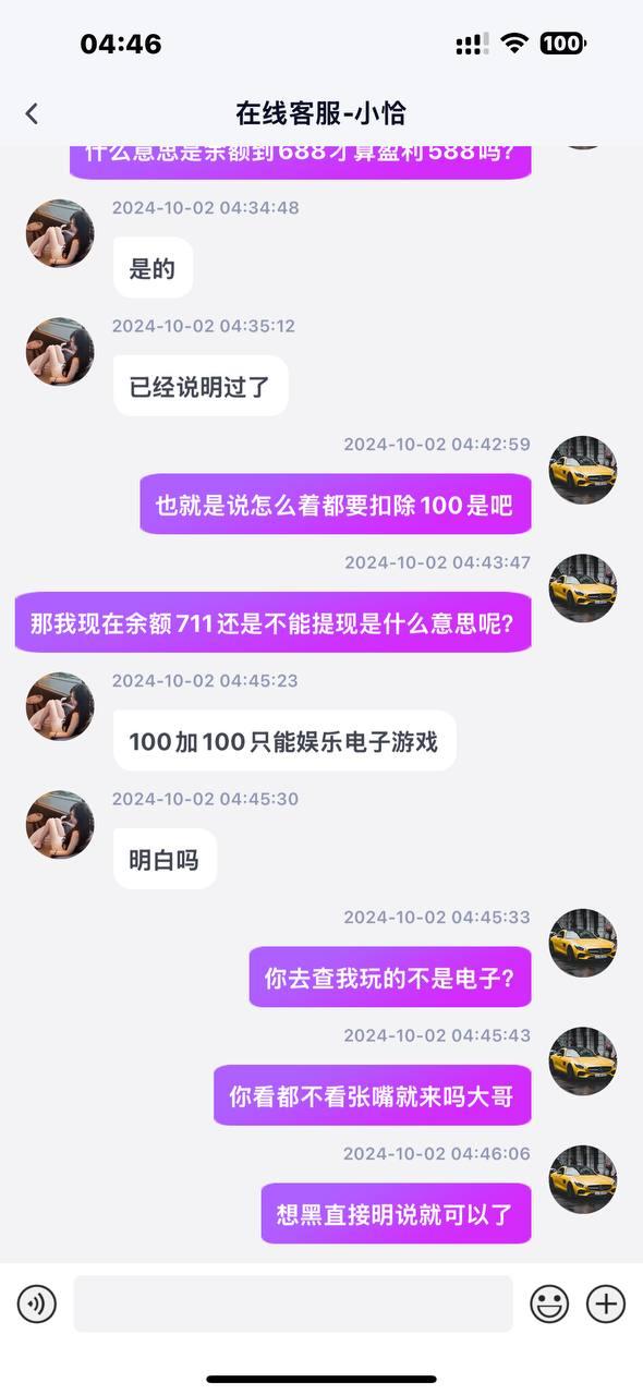 说是首存100+100一杯流水盈利588即可提现。我打到590提现显示差流水,客服说要盈利588,我又打到710提现还是不给出,各种理由不给出款,黑台大家避雷