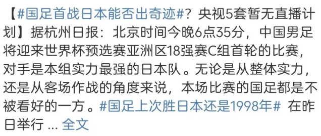 本场比赛,广大中国球迷通过何种渠道观看中国队比赛,可能也是一个大问题。因为央视的直播安排里,并没有这场中日大战。