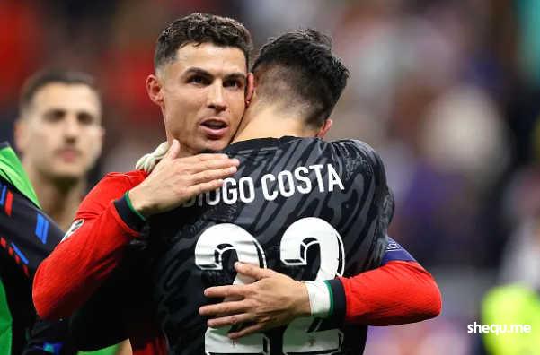 第1轮,伊利西奇主罚点球,迪奥戈-科斯塔成功扑出。C罗为葡萄牙队第一位上前主罚命中,以39岁147天成为欧洲杯历史上点球大战攻入点球的最年长球员。