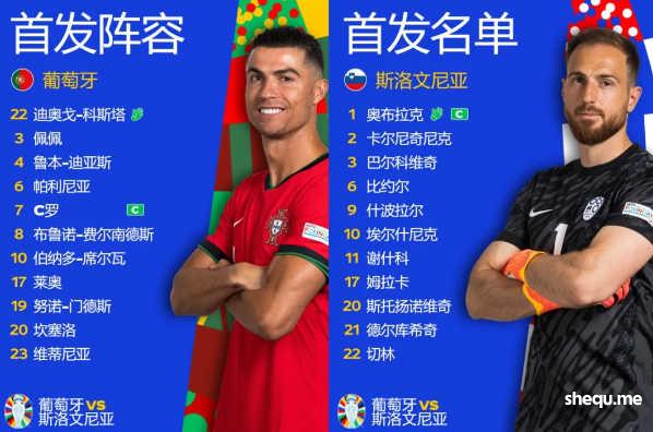 C罗领衔葡萄牙队首发,B费、B席、莱奥、佩佩上阵。奥布拉克担任斯洛文尼亚队长,谢什科、什波拉尔出战。